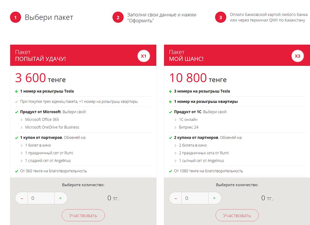 Правила участия более чем просты. Вы просто проходите процесс регистрации, после чего получаете номер участника. Чтобы зарегистрироваться в проекте, вам нужно выбрать для себя пакет стоимостью от 3600 до 26000 тенге и оплатить его. Номера участников опускаются в барабан, он крутится, и авторитетные люди, которым доверяет вся страна, вытаскивают номер победителя розыгрыша.