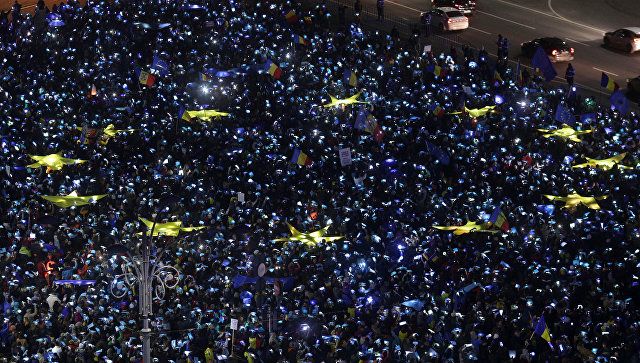 Митингующие собрались на площади Победы в Бухаресте вечером в воскресенье. Участники антиправительственной демонстрации выкрикивали лозунги "Увольнение!" и "Вы воры". Во время акции они сформировали флаг Евросоюза из 12 золотых звезд, расположенных по кругу на синем фоне.