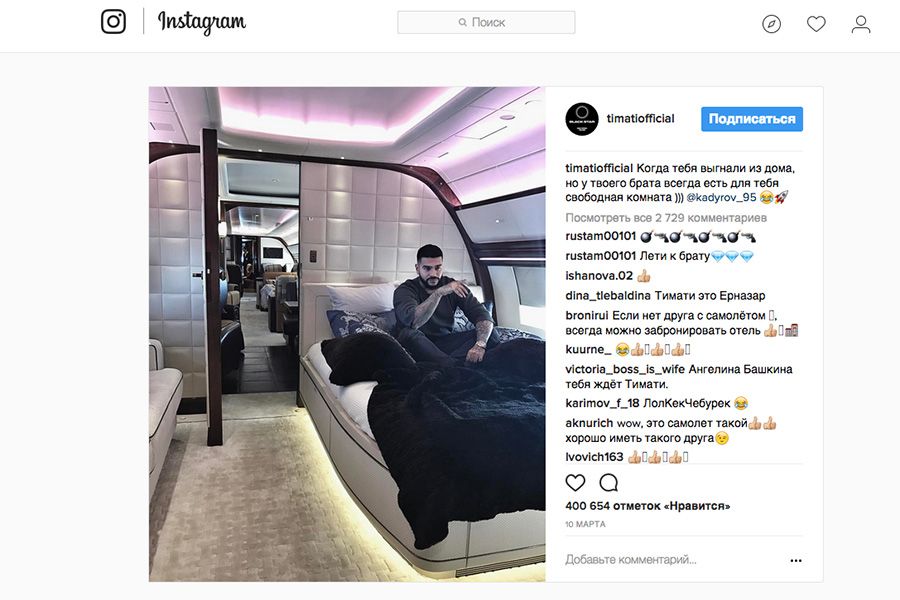 По информации телеканала, интерьер частного самолета, фото в котором в своем Instagram опубликовал популярный хип-хоп исполнитель Тимати, идентичен салону бизнес-джета Airbus ACJ319 — это один из самых шикарных и дорогих самолетов в мире, рассказал «Дождю» сотрудник компании Airbus. Его цена, по данным профильных сайтов, может достигать $80 млн.