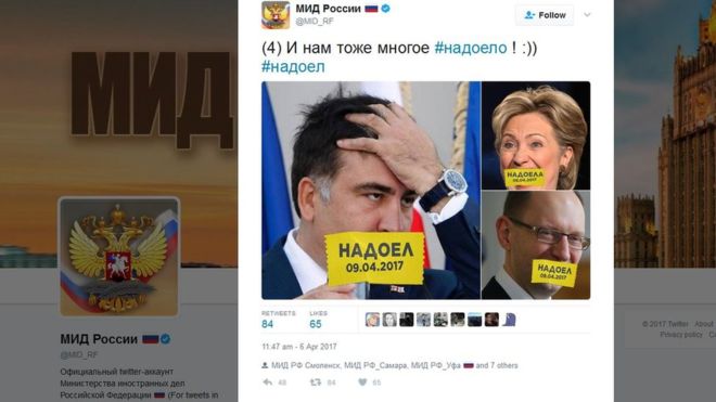 Министерство иностранных дел России опубликовало в своем официальном "Твиттере" фотоколлажи с несколькими западными политиками, к которым пририсованы ярко-желтые ярлыки со словом "надоел", сообщает Русская служба BBC.