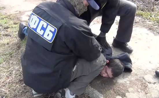 После этого мужчину спрашивают: «За что задержаны, догадываетесь?». В ответ подозреваемый отвечает: «Да». Во время обыска у задержанного находят пистолет, похожий на пистолет Макарова. Магазин пистолета заполнен патронами только наполовину. Во время осмотра и неполной разборки пистолета сотрудники ФСБ заявляют: «Боевой». Также у мужчины находят пакет, а в нем — мобильный телефон и провода.
