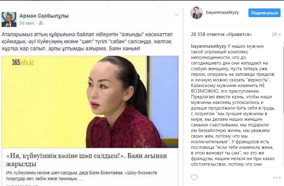 "У наших мужчин такой огромный комплекс неполноценности, что до сегодняшнего дня они нападают на слабую женщину, пусть теперь уже пером, опираясь на заповеди предков и личную можно сказать "верность". Казахскому мужчине изменить невозможно, это преступление. Предлагаю ввести казнь, чтобы наши мужчины наконец успокоились и дальше продолжали бить себя в грудь, с лозунгом "мы лучшие мужчины в мире, мы делаем наших женщин самыми счастливыми, мы подарили им беззаботную жизнь, мы уважаем своих жён, потому что мы исключительные".