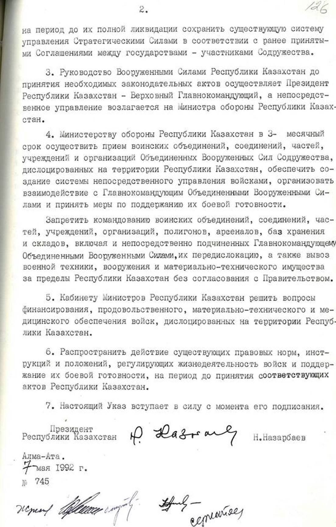 "У нас не было кадров, не было опыта. Не было понимания, какой должна быть армия суверенного Казахстана. В этих условиях было решено все подразделения, находившиеся на территории республики и оставшиеся от Среднеазиатского и Туркестанского военных округов и 40-й Армии, вышедшей из войны в Афганистане, объявить частями Вооруженных сил Казахстана. Такой Указ мной был подписан 7 мая 1992 года", — сказал глава государства в ходе выступления 7 мая 2007 года.