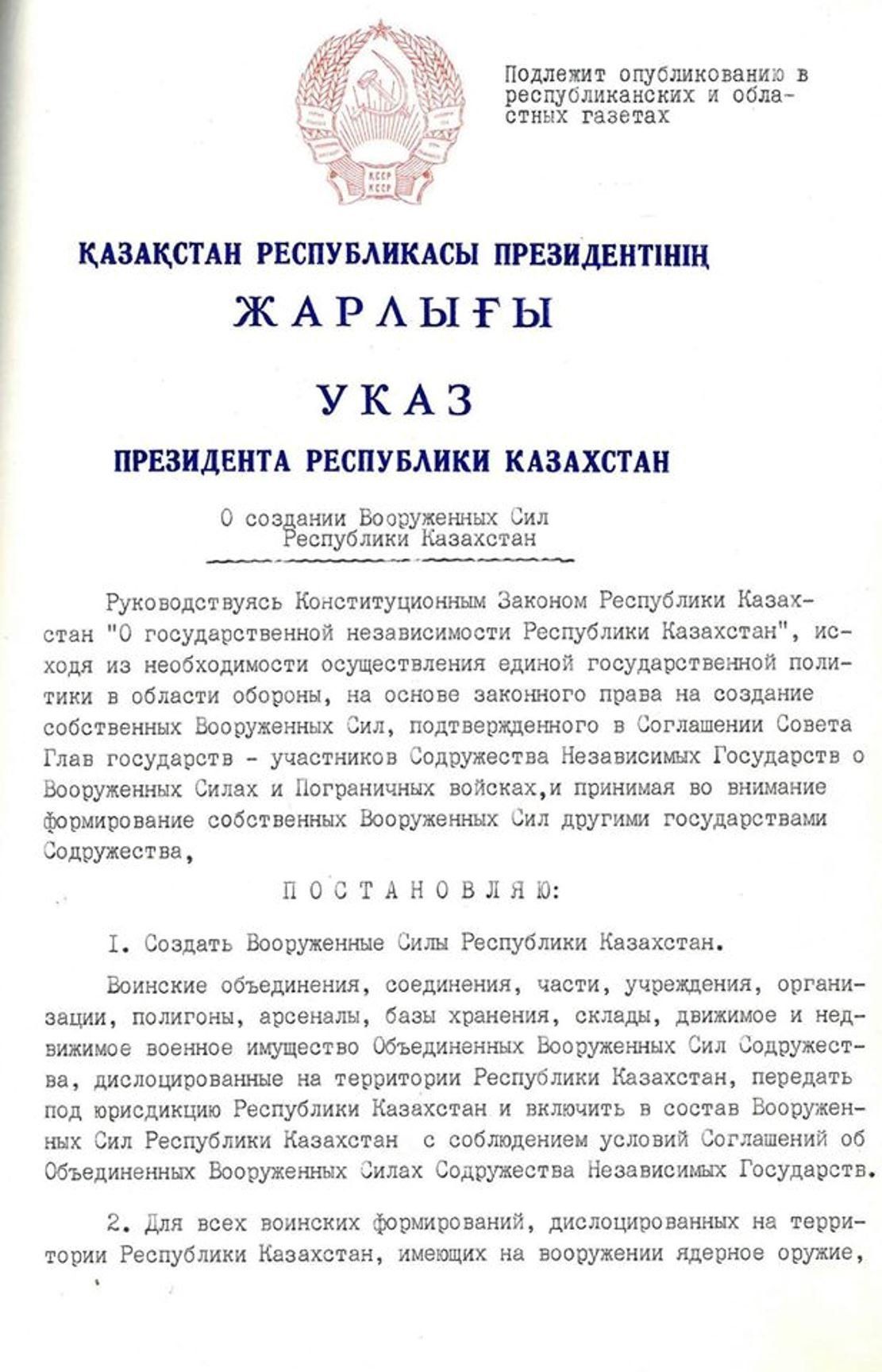 сил Республики Казахстан, а также исторический указ президента РК от 7