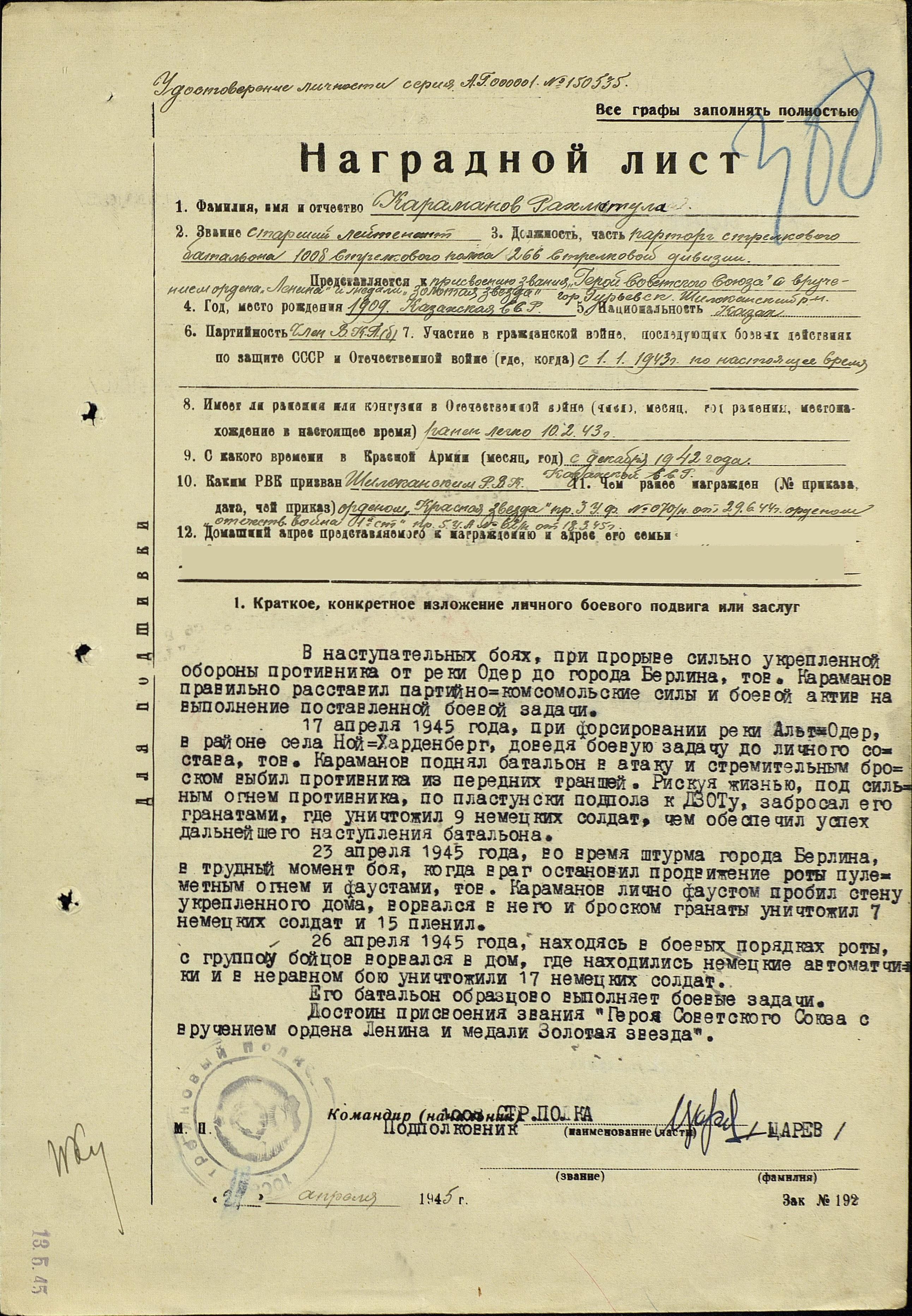 Стоит привести этот наградной лист дословно: «В наступательных боях, при прорыве сильно укрепленной обороны противника от реки Одер до города Берлина тов. Караманов правильно расставил партийно-комсомольские силы и боевой актив для выполнения поставленной боевой задачи. 17 апреля 1945 года, при форсировании реки Альт-Одер в районе села Ной-Харденберг, доведя боевую задачу до личного состава, тов. Караманов поднял батальон в атаку и стремительным броском выбил противника из передних траншей. Рискуя жизнью, под сильным огнем противника, по-пластунски подполз к ДЗОТу, забросал его гранатами, где уничтожил 9 немецких солдат, чем обеспечил успех дальнейшего наступления батальона. 23 апреля 1945 года, во время штурма города Берлина, в трудный момент боя, когда враг остановил продвижение роты пулеметным огнем и фаустами, тов. Караманов лично фаустом пробил стену укрепленного дома, ворвался в него и броском гранаты уничтожил 7 немецких солдат и 15 пленил. 26 апреля 1945 года, находясь в боевых порядках роты, с группой бойцов ворвался в дом, где находились немецкие автоматчики и в неравном бою уничтожили 17 немецких солдат.