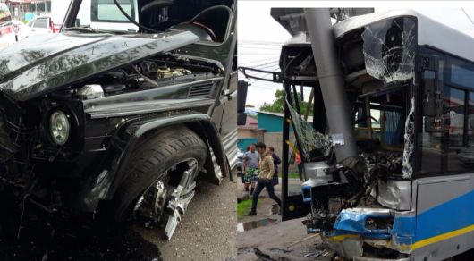Крупная авария произошла 11 мая в 10 утра. Водитель внедорожника Mercedes-Benz G-класса, двигаясь в восточном направлении по проспекту Райымбек батыра, на пересечении с улицей Потемкина при совершении маневра вправо допустил столкновение с автобусом, который ехал по "выделенке".