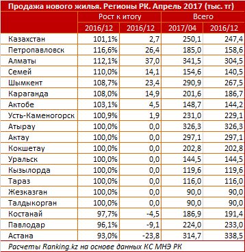 Далее идет Алматы с ростом на 12,1%, 1 кв. м. нового жилья в апреле 2017 года в мегаполисе стоит 341,5 тыс. тг.