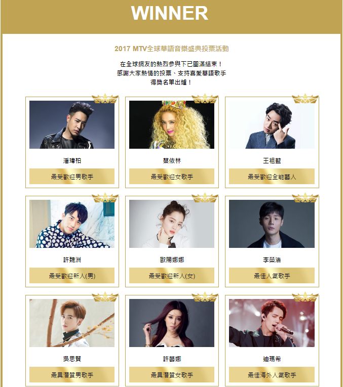 Отметим, награждение победителей «2017 MTV Global Chinese Music Awards» состоится 2 июля в городе Шэньчжэнь. Это самое масштабное музыкальное мероприятие в Китае. По итогам будут награждены 19 победителей. В 2016 году корейский певец Чон Джихун (Rain) победил в номинации «Лучший зарубежный популярный певец».