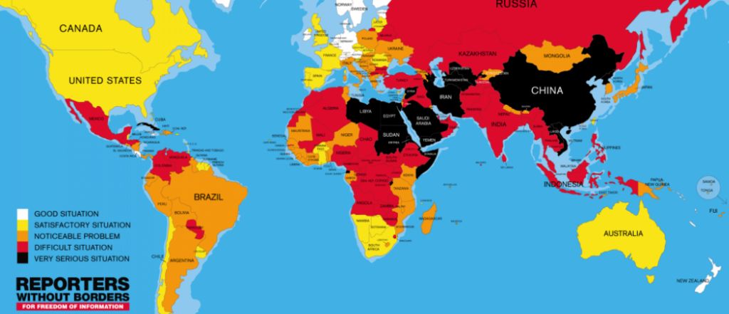 Ребята из известной неправительственной правозащитной организации «Репортеры без границ» представили нам свою традиционную карту свободы прессы за 2017 год. На ней территория Казахстана залита красным. Что это значит? Ежегодный «Индекс свободы прессы в мире» оценивает положение со свободой слова и свободой СМИ в 180 странах мира. Хуже всего журналистам в Сирии (177), Туркмении (178), Северной Корее (179) и Эритрее (180 место). Поэтому на карте они черного цвета. Мы – на 157 месте с индексом 54.01 и формулировкой «сложная ситуация». Согласно исследованиям «Репортеров без границ», давление на СМИ в Казахстане продолжает усиливаться, от адского индекса «очень опасная ситуация» казахстанскую независимую прессу отделяет одна палочка, всего плюс один пункт и нас задушит черным. Для сравнения – Россия на 148 месте, Украина – на 102, Киргизия – на 88, США – 49, потрясающий пример Эстония с ее 10 местом и белым цветом, символизирующим свободу прессы в этой маленькой стране с общим с нами прошлым.