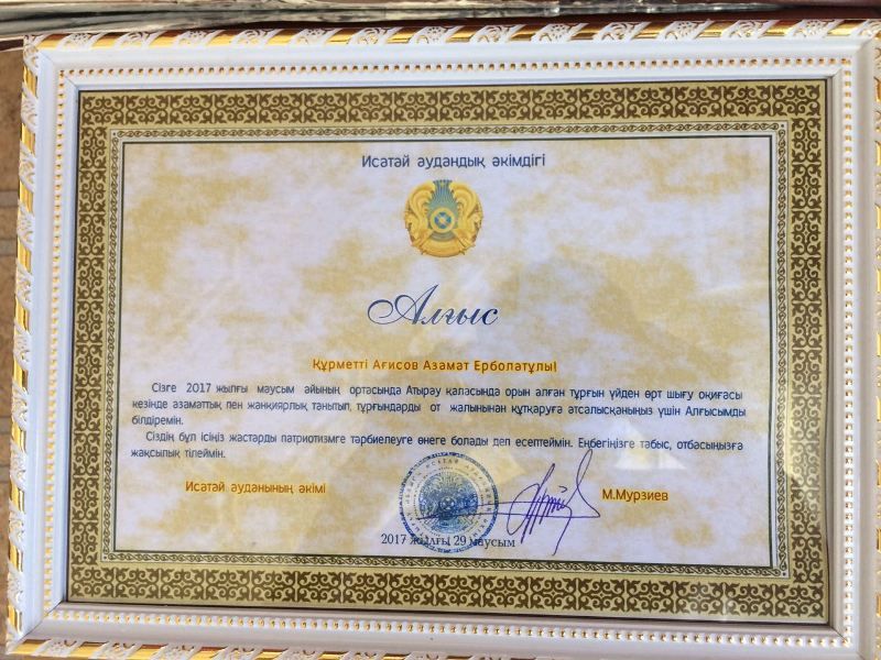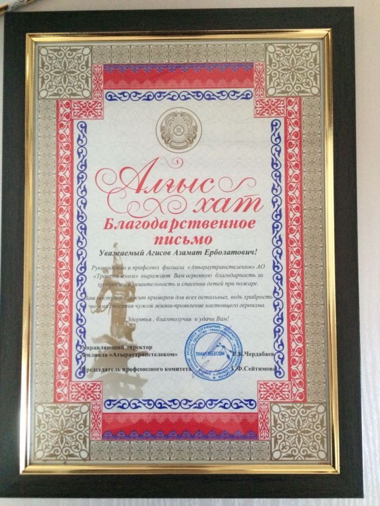 Только 29 июня в селе Аккистау аким Исатайского района Марат МУРЗИЕВ принял Азамата АГИСОВА, вручил ему благодарственное письмо и памятный подарок. А начальник районного отдела ЧС Ринат КУРМАНГАЛИЕВ то ли в шутку, то ли всерьёз предложил работу в своём ведомстве. Но у Азамата есть работа – инженером в филиале АО “Атыраутранстелеком”. Там, кстати, управляющий директор Руслан ЧЕРДАБАЕВ собрал коллектив и тоже вручил Азамату благодарственное письмо и памятный подарок.