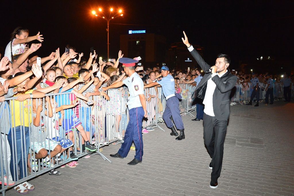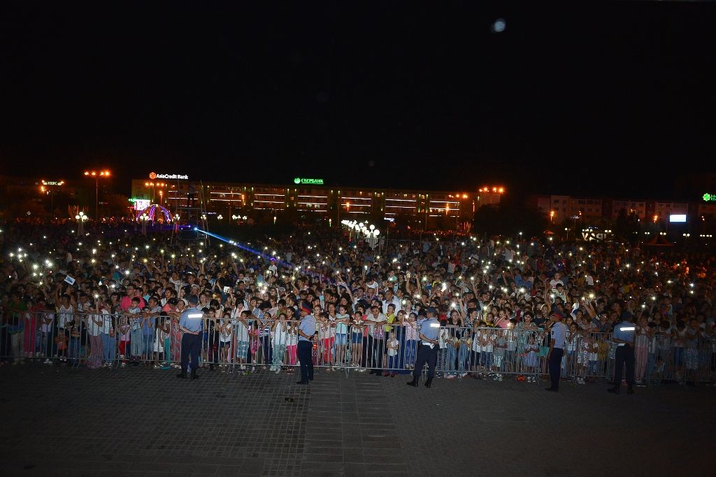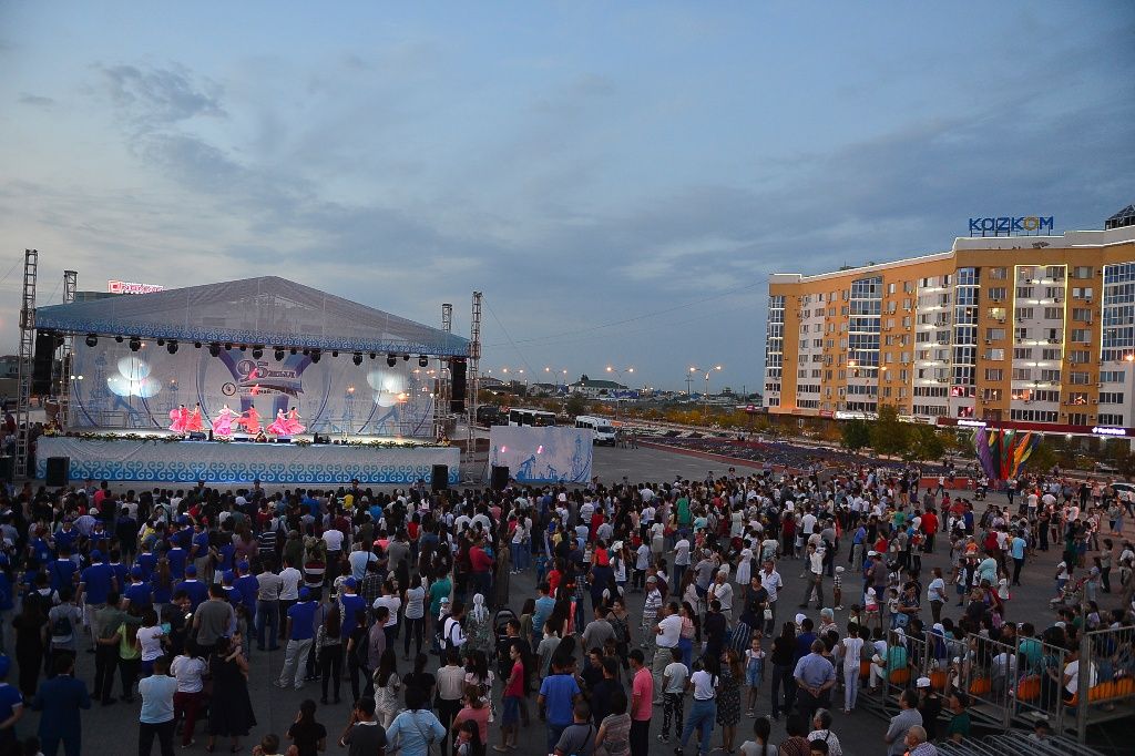 Концерт начался с выступления трио «С-Класс», которое вдохновенно исполнило патриотическую песню «Казахстан – байтак елiм». Певец, деятель культуры РК Куандык Нугымаров со знанием дела исполнил песни из репертуара Льва Лещенко «Соловьиная роща» и Николая Баскова «Все цветы». Жанар Ермагамбетова исполнила попурри из любимых казахских песен, ключевой среди которых была, конечно же, «Сынарымсын». Публика под эту песню пустилась вальсировать. Стемнело, на площади от собравшихся жителей и гостей города не осталось свободного места. Количество кружащихся в вальсе пар увеличилось во время выступления Медета Карамырзы с известной песней «Каспий толкындары».