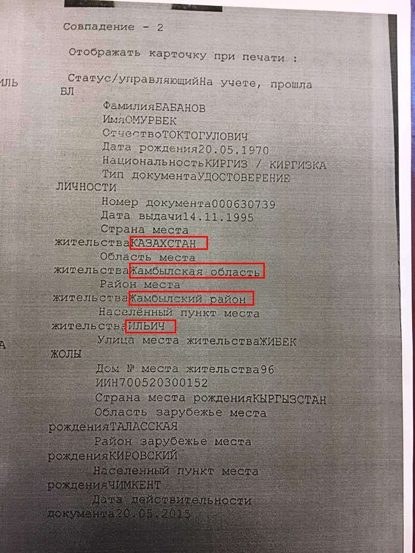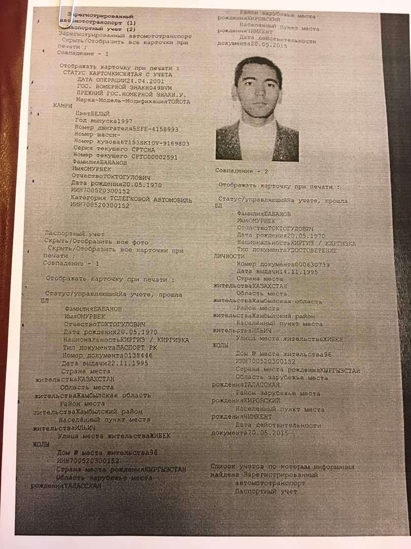 Кыргызское издание приводит данные Банка данных населения Республики Казахстан и документы о регистрации автотранспорта, где сообщается, что родился Бабанов в селе Чимкент Таласской области Кыргызстана, а казахстанский паспорт Бабанову МВД выдало 22 ноября 1995 года, удостоверение гражданина РК – неделей ранее. Проживал он в селе Ильич Жамбылской области (ныне Акбулым).