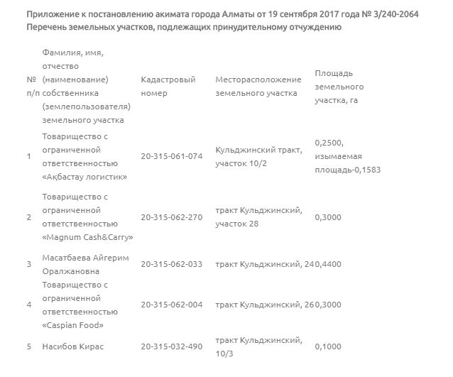 В приложении к постановлению публикуется перечень земельных участков, подлежащих принудительному отчуждению. Среди попавших в список землепользователей - ТОО "Magnum Cash&Carry", ТОО "Caspian Food", ТОО "Ақбастау логистик".