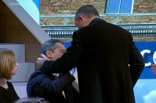 Эти слова еще больше раззадорили ведущего. Он схватил американца за пиджак и угрожающе заявил: «Ты что думаешь, я только языком могу? Ты что меня провоцируешь? Я тебе сказал сидеть? Сиди!».