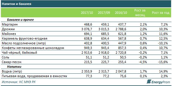 Среди продуктов бакалеи более чем на 1% подорожали к сентябрю только маргарин (+2,1% за месяц, до 468,6 тг), дрожжи (+2%, до 3,1 тыс. тг за кг) и майонез (+1,2%, до 694,1 тг).
