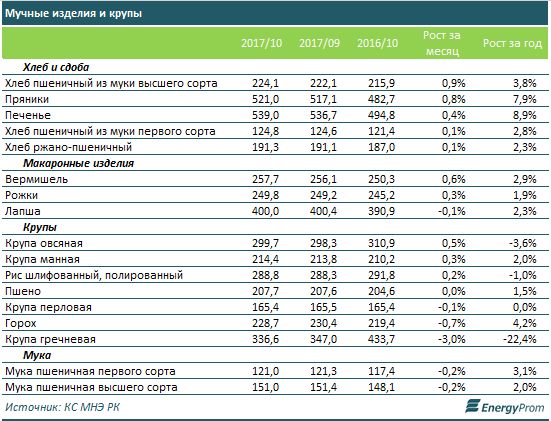 В сегменте мучных изделий и круп значительного роста цен не отмечено (не более чем на 1%). Заметное удешевление зафиксировано только для гречневой крупы - сразу минус 3% к сентябрю, до 336,6 тг за кг.