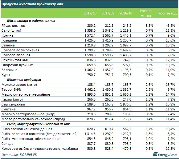 Пока же, по итогам октября 2017 наиболее заметно среди всей продукции животного происхождения выросли в цене яйца - на 8,3% за месяц, до 230,2 тг за десяток. Прочие продукты в сегменте мяса, птицы и изделий из них подорожали к сентябрю на более чем 1%.