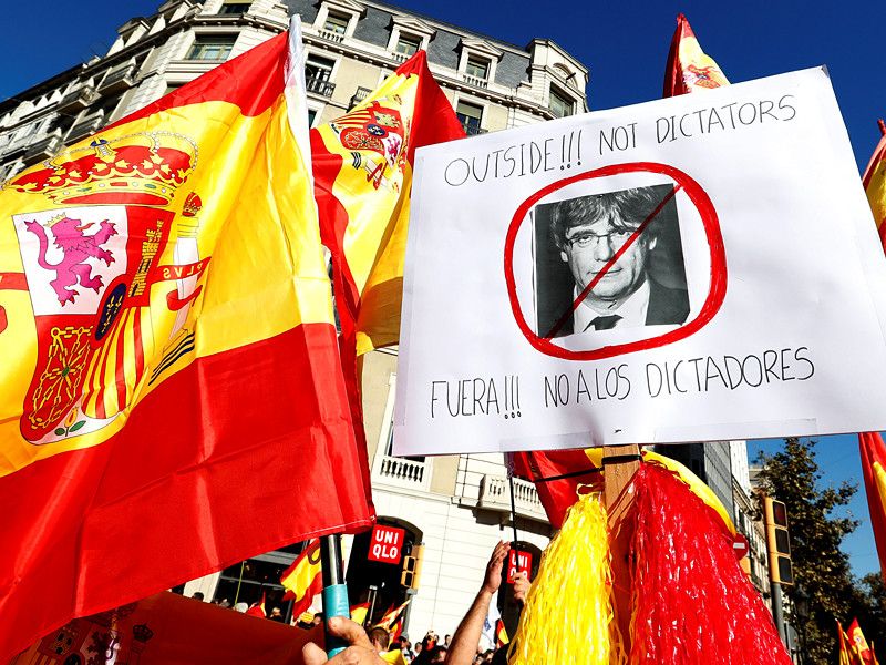 Они собрались под лозунгами "Мы все каталонцы!", "Мы все Испания!", "Мы хотим остаться вместе!". Участники марша размахивали испанскими национальными флагами, когда продвигались через центр Барселоны.