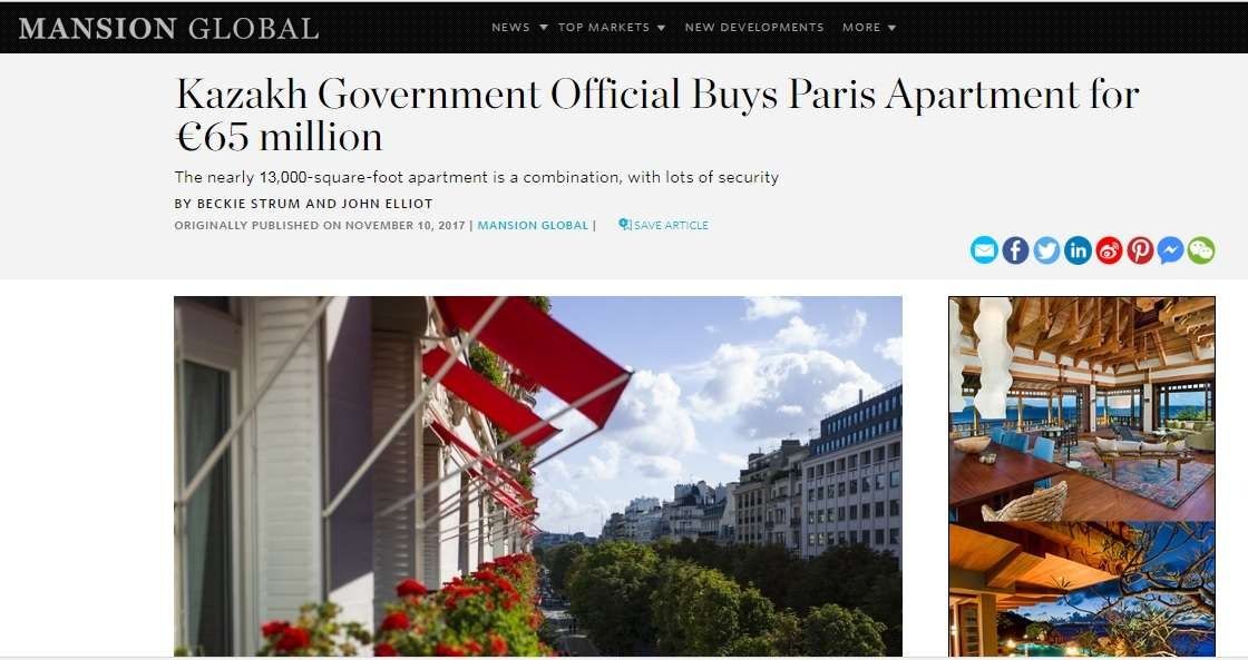 Официальный представитель Правительства Казахстана купил квартиру в Париже с высоким уровнем безопасности за 65 млн евро (75,8 млн долларов). Это самая крупная сделка, совершённая в Париже в 2017 году, со ссылкой на Mansion Global передает Informburo.kz.