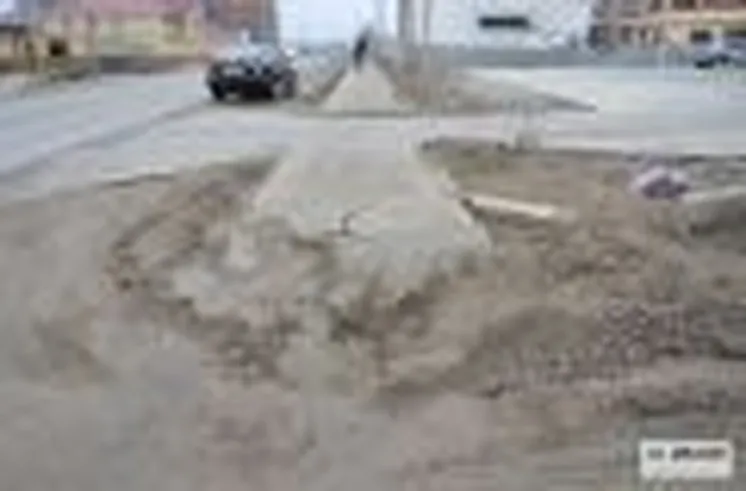 Здесь сломали часть тротуара и сделали въезд для грузовых автомашин к новостройкам. После дождя это место тонет в грязи. Повсюду разбросаны строительные материалы. Пешеходы, особенно дети, скользят и падают...