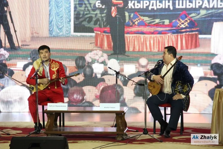 Ещё одна пара - Серикбол ПАНАБЕРДИЕВ и Онербек ДАУЛЕКЕНОВ: Серикбол работает корреспондентом в газете «Нарын таңы» Исатайского района, а Онербек - преподаватель, готовит будущих айтыскеров в Малой академии искусств.