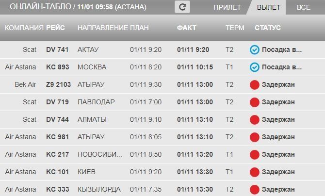 "Международный аэропорт Нурсултан Назарбаев города Астаны в целях обеспечения безопасности полетов по причине метеоусловий закрыт, предварительно до 13:00. Пассажирам рекомендуется уточнять информацию по своим рейсам в колл-центрах авиакомпаний", — говорится в сообщении комитета в соцсети.