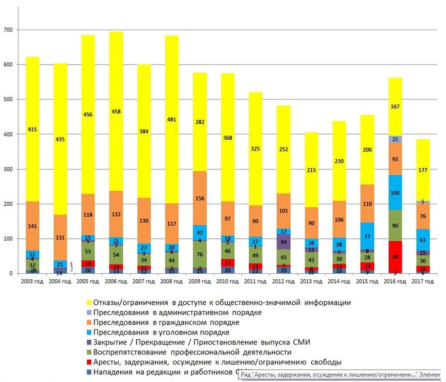 В рейтинге стран мира по уровню свободы слова, по версии Freedom House, Казахстан в 2017 году занял 179 место из 196 (В 2016 г. 160 место из 180). Фонд «Адил соз сделал гистограмму нарушений свободы слова в Казахстане, начиная с 2003 года: