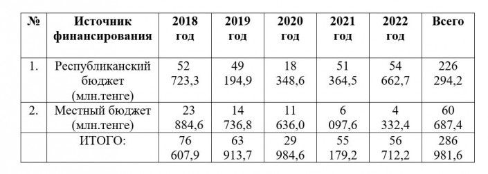 "На реализацию программы в 2018-2022 годах будут направлены средства республиканского и местных бюджетов, а также другие средства, не запрещенные законодательством Республики Казахстан. Общие затраты из бюджета на реализацию программы составят 286 миллиардов 981,6 миллиона тенге (республиканский бюджет - 226 миллиардов 294,2 миллиона тенге, местный бюджет - 60 миллиардов 687,4 миллиона тенге). Объемы финансирования из республиканского и местных бюджетов будут уточняться при формировании бюджетов на соответствующий период", - говорится в документе.
