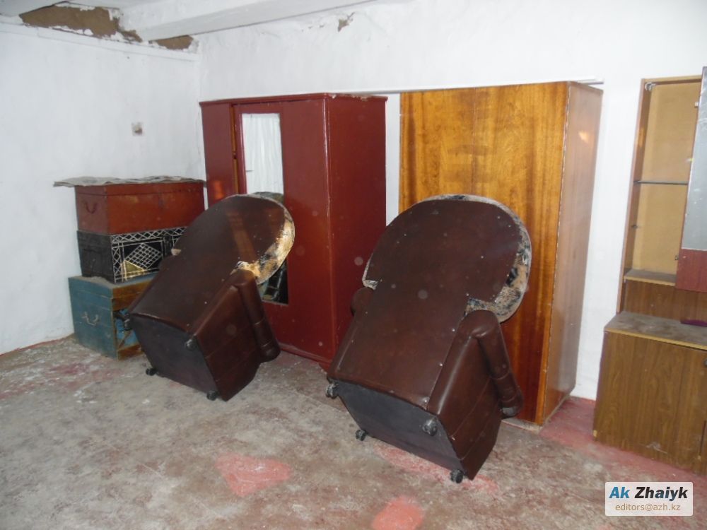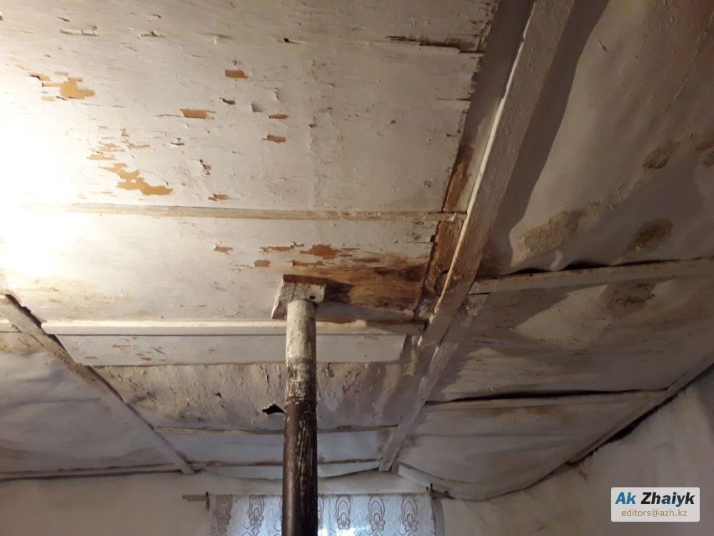 Жилье Аксерика ЖЕКЕНОВА, построенное в 1953 году, тоже находится в аварийном состоянии. Фундамент отсутствует, строение держат только сваи. С потолка течет, он прогнил, может рухнуть в любой момент. У них трое маленьких детей. Аксерик - охранник, получает 45 тысяч тенге, супруга работает в детском саду, зарплата мизерная.