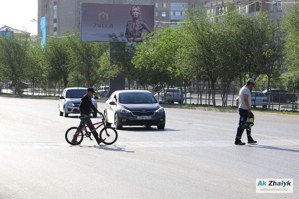 Ваш покорный слуга ездит из мкр. Нурсая на работу и обратно на велосипеде, а это приличное расстояние по разным улицам. И что же я вижу? Всюду пробки и некультурные водители обходят их по пыльной обочине, совершая запрещённый обгон справа. И при этом угрожая совершить наезд на беззащитного велосипедиста. Возвращаясь домой, я сперва выбираю улицу Гагарина - там не так много машин, дорога широкая и обочины выложены бетонными плитами. С нее поворачиваю на улицу Худина, пересекающуюся с весьма оживленной улицей Жарбосынова, потом на Кулманова, и возле автобусной остановки "Академия" - на проспект Сатпаева. Отсюда и до велодорожки уже недалёко, но движение машин очень интенсивное. Поэтому лучше ехатъ по тротуару, пусть и нарушив при этом правила. Авось полиция не оштрафует...