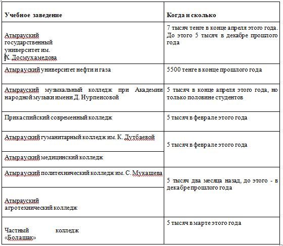 Корреспондент «АЖ» опросил по два студента из 9 местных вузов и колледжей, и по последним выплатам получилась вот такая таблица: