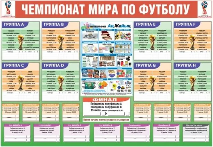 В завтрашнем номере (от 14 июня) газеты «Ак Жайык» на цветном развороте традиционно публикуется эксклюзивная Таблица чемпионата мира по футболу - 2018. По многочисленным отзывам наших читателей, она легко воспринимается зрительно и удобна для заполнения результатов сыгранных матчей. В общем, таблица «АЖ» - чемпион по сравнению со множеством других таких таблиц. Всем приятных эмоций!