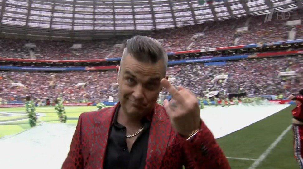 Британский певец Робби Уильямс, закончив свое выступление на церемонии открытия ЧМ-2018, показал в камеру неприличный жест, сообщает vz.ru.