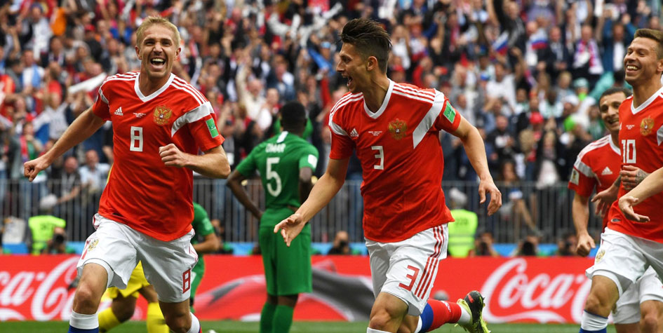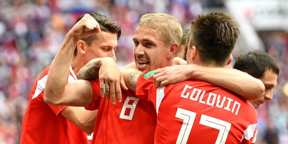 Стартовый матч на ЧМ-2018 закончился со счетом 5:0 в пользу россиян. Матч был единственным в первый день чемпионата, и пока сборная России вышла на первое место в группе А, передает РБК.
