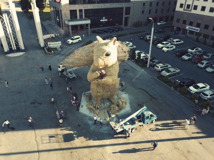 Несколько дней назад перед выставкой "Атакент" в Алматы установили белку высотой 12 метров и весом около 12 тонн. Она изготовлена из соломы, металла и дерева. Общая стоимость инсталляции - 23 миллиона тенге. Белка должна простоять около девяти месяцев, до первых морозов.