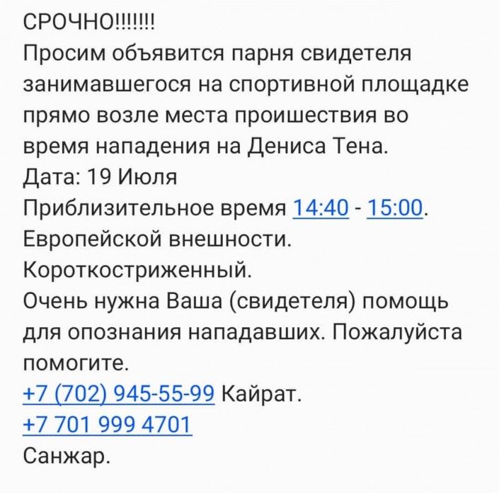 Друзья Дениса Тена обратились к парню, который мог стать свидетелем нападения. Ранее объявление было размещено в соцсетях, однако свидетель до сих пор не откликнулся, передает корреспондент Tengrinews.kz.