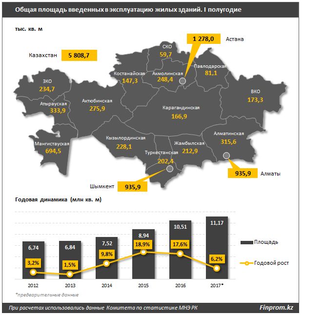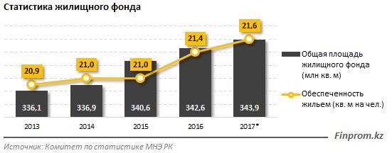Более того, на одного казахстанца по итогам 2017 года приходится всего 21,6 кв. м жилья (годом ранее было 21,4 кв. м, в 2013 - всего 20,9 кв. м), в то время как стандарты ООН требуют минимум 30 кв. м на человека. При этом, если в городах на человека приходится сразу 24,2 кв. м, то в сельской местности - всего 18,2 по итогам прошлого года.