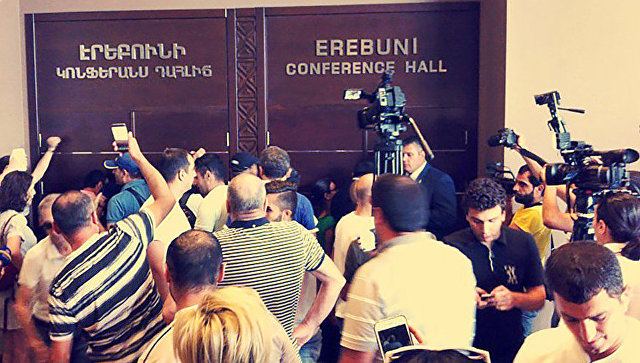 Протестующие против освобождения из-под стражи экс-президента Армении Роберта Кочаряна ворвались в зал, где начиналась его пресс-конференция, передает корреспондент РИА Новости.