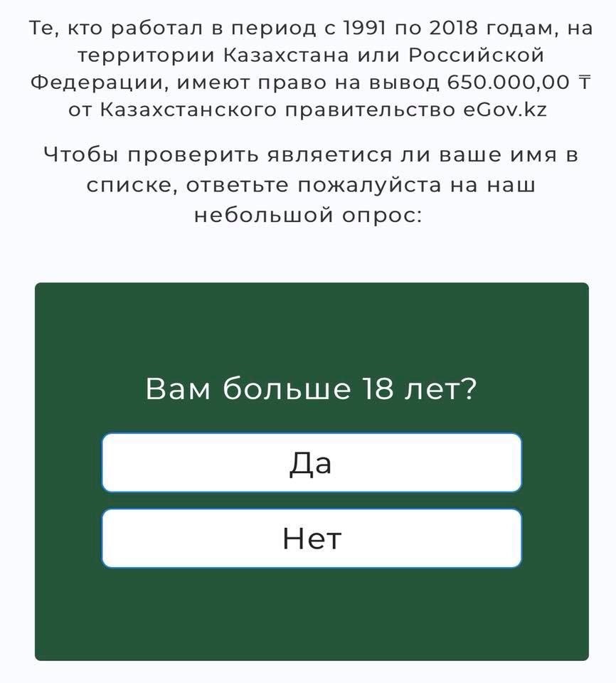 Напомним, что в фейковой рассылке, которую получили казахстанцы, сообщалось, что те, кто работал в период с 1991 по 2018 годы на территории Казахстана или России, имеют право на вывод 650 тысяч тенге от eGov.