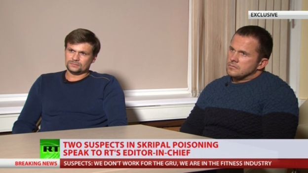 Какую-либо причастность к отравлению Скрипалей они категорически отвергли. По их словам, они действительно были в указанные даты в Солсбери, но ездили туда исключительно в туристических целях, флакон духов (в котором, предположительно, перевезли отравляющее вещество) не возили, о Скрипалях ничего не слышали до недавнего времени, в ГРУ не работают. Себя они назвали жертвами чудовищного стечения обстоятельств.