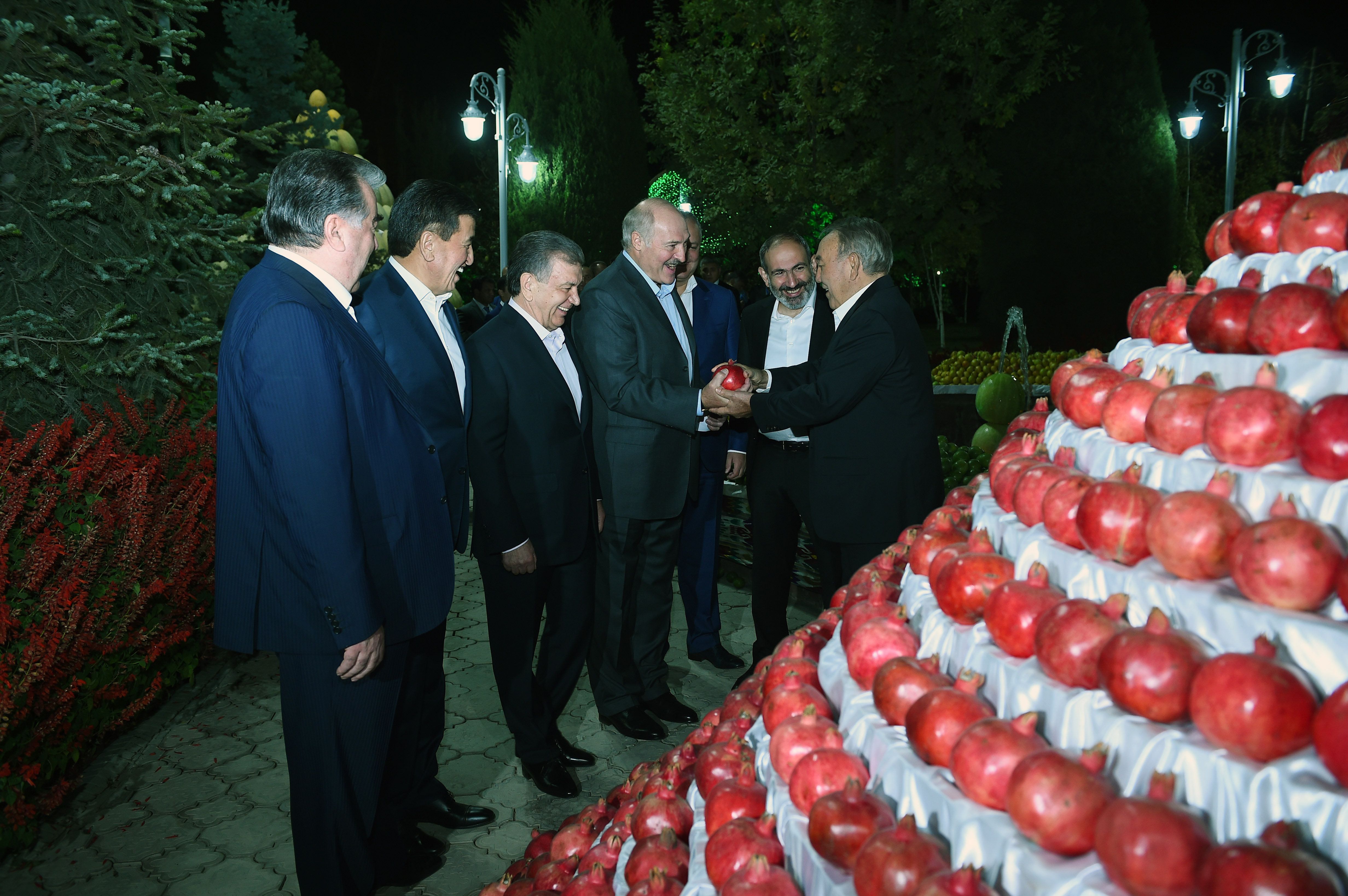В Душанбе лидеров стран встретили с размахом. Для высоких гостей устроили Вечер дружбы в роскошном саду с овощами и фруктами.