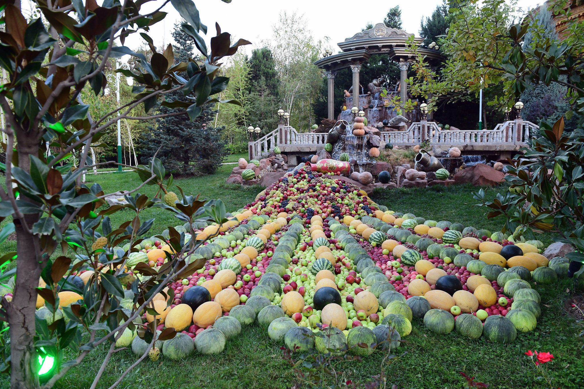 В "райском саду" для VIP-персон установили разноцветные композиции из арбузов, дынь и виноградов, а также фонтанты из тыкв.