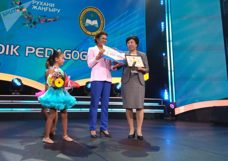 Сегодня в Астане 48 преподавателей из разных регионов получили в качестве подарка чек на сумму 2,4 млн тенге.