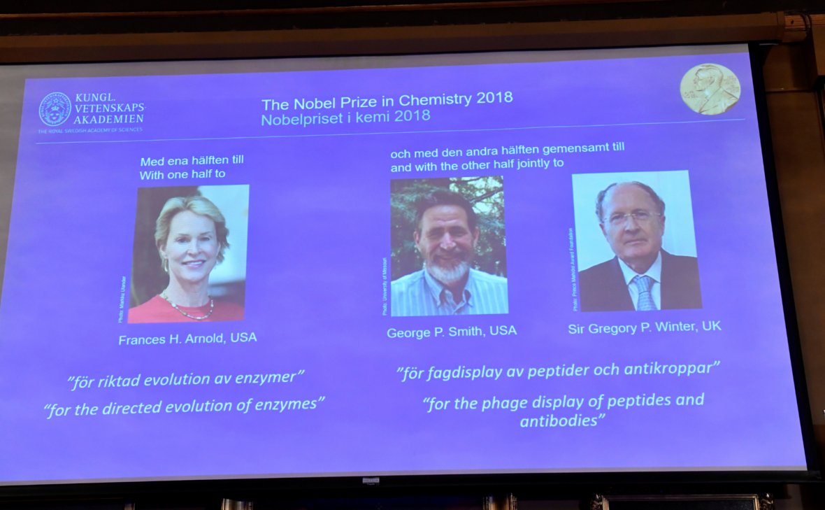 Фрэнсис Арнольд стал лауреатом премии «за направленную эволюцию ферментов», Смит и Уинтер — «за фаговое отображение пептидов и антител».