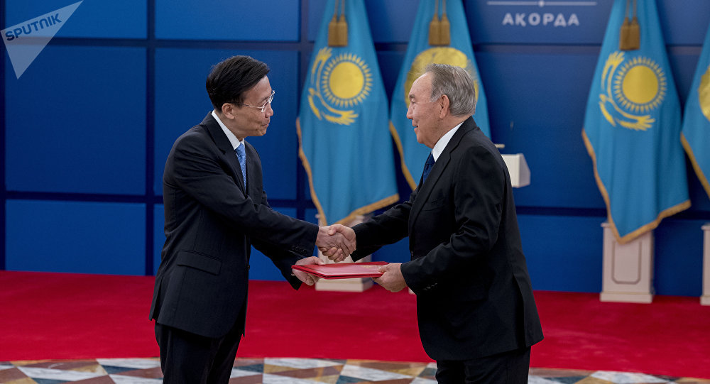 Чрезвычайный и Полномочный посол Китайской Народной Республики Чжан Сяо и президент Казахстана Нурсултан Назарбаев во время церемонии вручения верительных грамот