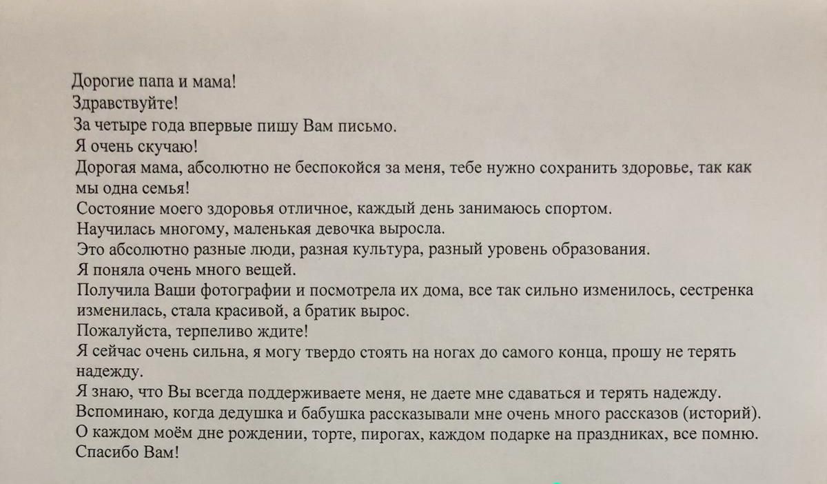 "Состояние моего здоровья отличное, каждый день занимаюсь спортом. Научилась многому, маленькая девочка выросла. Это абсолютно разные люди, разная культура, разный уровень образования. Я поняла очень много вещей. Получила Ваши фотографии и посмотрела их дома, все так сильно изменилось, сестренка изменилась, стала красивой, а братик вырос", — написала она родным.