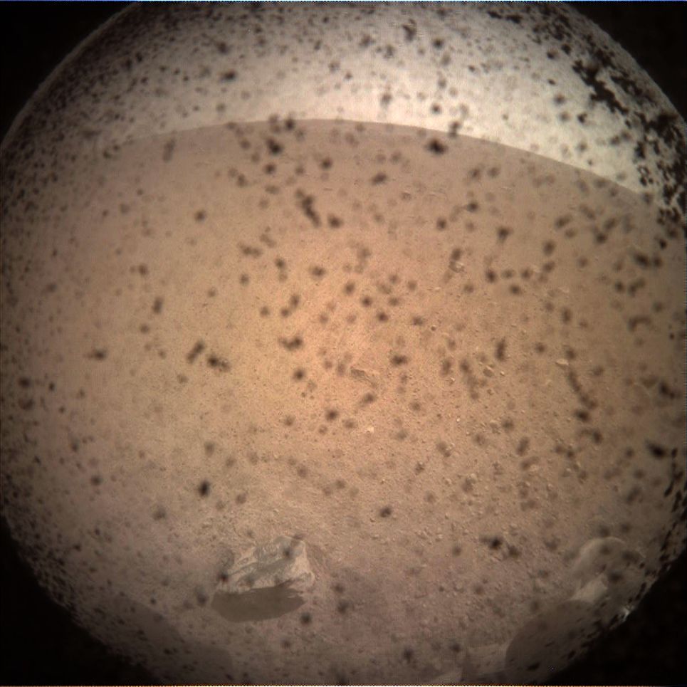 После этого специалисты сообщили, что получено первое фото. На нем можно разглядеть частицы пыли и марсианский горизонт.