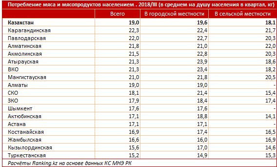 Главные «мясоеды» сельской местности живут в Алматинской (22 кг), Карагандинской (21,7 кг) и Мангистауской (20,5 кг) областях.