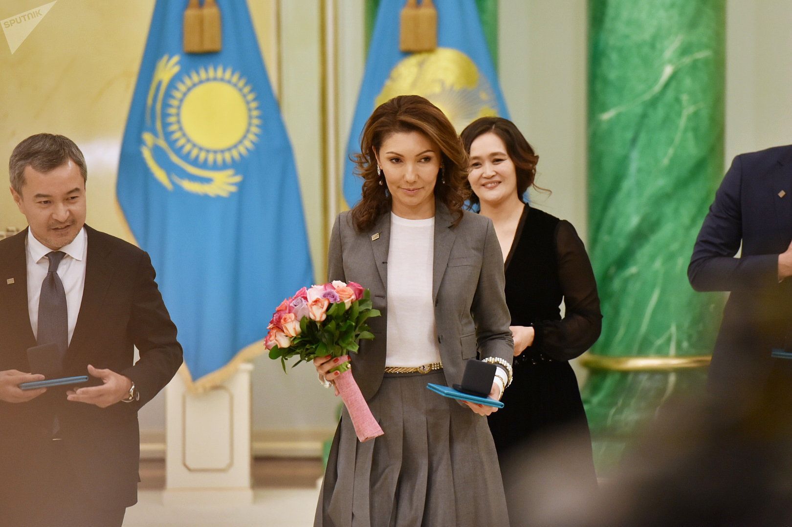 Глава государства Нурсултан Назарбаев поцеловал дочь в щеку и поздравил на церемонии награждения.