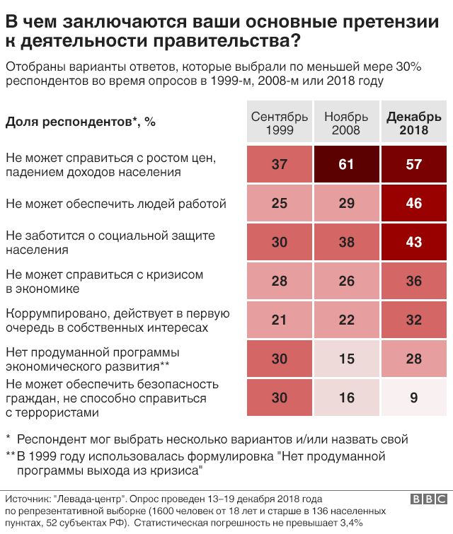 Одновременно центр опубликовал результаты другого опроса: по поводу того, что именно не устраивает россиян в работе кабинета министров. Традиционно много набирают варианты ответов, касающиеся экономических и социальных проблем, а проблема терроризма и вопросы безопасности явно ушли на второй план по сравнению с концом 1990-х.